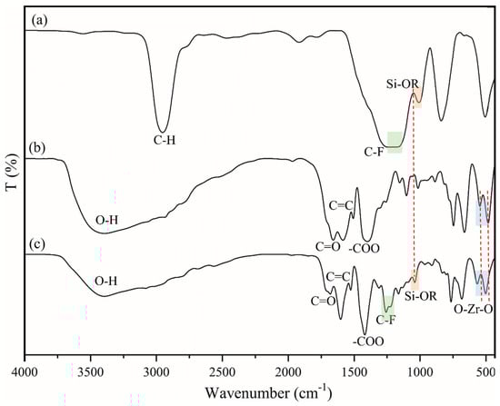 FTIR vibrational spectra for (a) FAS, (b) UiO-66, and (c) UiO-66/FAS.