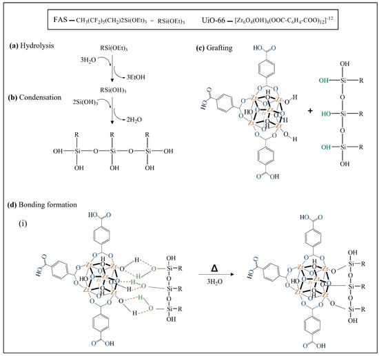 Referring to the proposed interaction in Figure 12, Zr–O species in the secondary building unit (SBU) of UiO-66 plays a role in attracting the bonding formation with the silane moieties. In detail, the reaction is initiated by hydrolysation of silane by three hydrolysable substituents (triethoxy group) to silanol (RSi(OH)3). Then, it is followed by a condensation reaction, in which FAS that contains the silanol group is now ready to combine with another group by elimination of water molecules. Next is the grafting process. The O–H sites (O–H in green colour) at the silanol group interact by forming a hydrogen bond with possible sites at UiO-66, which is the O–H group at the metal cluster (O–H in black colour). During heat treatment at the last process, a covalent linkage is formed between UiO-66 and FAS molecule with simultaneous water loss. For clarification, the O–H bond in blue represents the twelve linkers for each Zr-cluster connected to another by their carboxylate groups. The drawing only represents three linkers for each SBU.