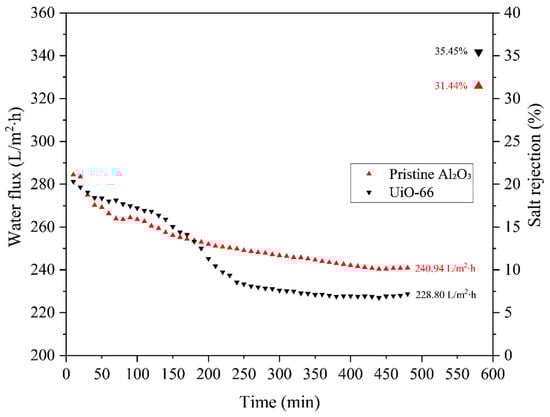 The DCMD system was employed to evaluate the effect of FAS concentration to confer hydrophobicity to the UiO-66 membrane. The long-term performance test was run for 8 h, where a 40,000 ppm NaCl solution was introduced into the lumen of the AHF and distilled water as permeate solution was introduced on the outer surface of the membranes. First, the pristine AHF (denoted as pristine Al2O3) and UiO-66 membrane were tested through the DCMD performance test. As depicted in Figure 13, the rejection of pristine Al2O3 and UiO-66 was 31.44 and 35.45%, with water flux of 240.94 and 228.80 L/m2∙h, respectively. After deposition of UiO-66, the rejection slightly increased due to the increases in contact angle degree of the UiO-66 membrane sample (Figure 9). The hydrophilic properties of membranes cause a relatively poor performance in MD. The results obtained from these membranes are still unsatisfactory to be used in MD operation system due to the wettability of the permeable membrane.