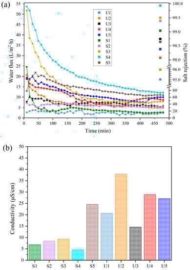 (a) Water fluxes and salt rejections, and (b) final conductivity values of lumen for the as-prepared membranes in a 8 h DCMD operation.