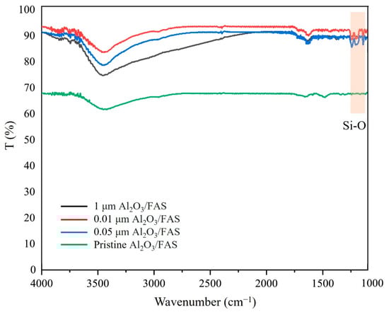 Furthermore, by comparing the performance of both batches, the untreated sample showed a slight reduction in salt rejection and water flux compared to the treated batch. From this observation, when the UiO-66 was introduced, the surface energy was maximised and produced the maximum number of accessible sites for the grafting process (Figure 15). Regarding the surface energy, three different sizes of sintered Al2O3 powder (0.01, 0.05, and 1 µm) were directly coated with FAS to observe the chemical interactions. Referring to the FTIR spectra (Figure 16), there is a weak absorbance in Si–O stretching, indicating fewer Si–O species in the sample, thus proving that it has a limited number of binding sites. Consequently, the presence of UiO-66 in the membrane has a significant effect on membrane performance, which can be correlated to the structural and physical characteristics of the membrane, such as specific surface area, porosity, and surface roughness. Apart from that, the incorporation of UiO-66 layer also led to substantial salt rejection because of its ability to form an electrostatic interaction with negatively charged NaCl.