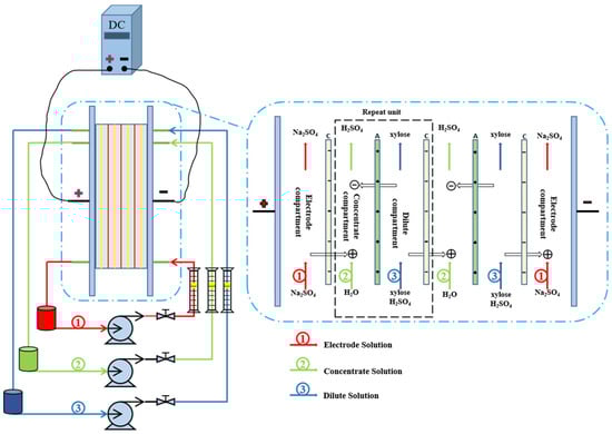 Recently, novel green technologies, such as membrane filtration, lime treatment, and chromatographic separation, were applied in relevant saccharification processes [6,7,8,9,10,11]. Among them, the electrodialysis (ED) process, which could selectively separate ions by using an ion-exchange membrane driven by an electric field, is the most promising. Lemaire et al. originally developed a purification process combing ultrafiltration (UF), ED, and ion-exchange resin to purify pentose [12,13]. UF is operated as a pretreatment unit to eliminate hazardous macromolecules. More than 80% of sulfuric acid could be recovered from monosaccharides without chemical consumption or waste generation. Meanwhile, the energy consumption and loss ratio of sugar are within an acceptable range. However, in these studies, the influence of lignin and protein as membrane foulants was not clear.