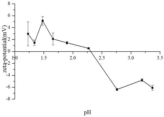 It is the basic principle of colloidal chemistry that an electrical double layer (the Helmholtz layer and an extended diffuse layer) around a charged surface reflects the specific properties of the counter-ions and the nature of the colloidal interface [26]. The zeta potential of colloidal particles is an indicator of the surface charge, which is estimated based on the electrophoretic mobility in the electric field and represents the stability of the colloidal particles or interfaces [27]. Hence, the zeta potential of colloidal particles is an important factor affecting electrodialysis performance and provides valuable information for the prediction of fouling potentials. The electrokinetic properties of colloidal particles are affected by the solution pH, which is observed in electrophoretic mobility measurements. As the deacidification proceeded, the pH increased. The zeta potentials of CAH as a function of pH are presented in Figure 4. At the beginning of the ED process, the CAH is pellucid. The initial value of zeta potential is about 3 mV, which means the surface charge of colloidal particles in CAH is weakly positive. The colloidal particles of CAH are relatively stable, as the electrical double-layer repulsion between the colloidal particles avoids particle aggregation. With the run of the ED process, the acid (H+ and corresponding anion) was removed, and the pH was increased from 1.1 to 3.4. The zeta potential of colloidal particles in CAH changed from a positive value to a negative value and reached the isoelectric point (IEP) at pH 2.3, approximately. During this ED process, the proton (H+) on the surface of colloidal particles is successively desorbed and removed, which leads to electrical double-layer repulsion and particle aggregation. The CAH liquor loses its colloidal stability and becomes cloudy.