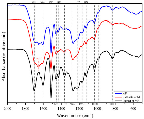 FTIR was used to contrastively analyze the three samples (a: original membrane foulant; b: raffinate of membrane foulant; and c: extract of membrane foulant), and the spectra are shown in Figure 6 and Table 5. All samples show the typical spectral bands (1604, 1515, 1453, 1430, and 1270 cm−1) that represented the aromatic regions of lignin, which indicates the predominance of lignin in membrane foulant [29]. Compared with the original membrane foulant (A), the intensity of the corresponding lignin signals of extract (C) is significantly increased, and the corresponding value of raffinate (B) is slightly decreased. This could be explained by the fact that the lignin could be dissolved by pure acetone in the Soxhlet extraction process, but the protein hydrolysate is insoluble in pure acetone. Therefore, a major part of the lignin was transferred to the extract (C). There are no other lignin signals in the spectra of the extract (C). And in the spectra of raffinate (B), the intensity of the spectral band at 1655 cm−1, which is assigned to the α-helix (amide I peak) structure of proteins, increased abruptly [30]. This proves the existence of proteins in the membrane foulant. This spectral change was due to the fact that the removal of lignin raised the content of proteins in the membrane foulant. The amide I peak is the most prominent peak in the protein spectrum and can be attributed to the α-helical component of the secondary structure [31]. Noticeably, after the long Soxhlet extraction, the lignin signals are still dominant in the spectra of raffinate (B). It may be concluded that strong chemical bonding, such as covalent linkage, excited between the residual lignin and protein. It has been reported that lignin could cross-couple with the side chain of amino acids, thereby creating covalent bonds between lignin and proteins [32].