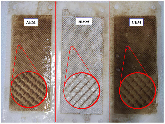 At the fourth stage (deterioration), with the further increase in pH, the zeta potential drops slowly. In the electric field, all the negatively charged colloidal particles move towards the AEM, and the self-aggregation deteriorates further. The colloidal nuclei develop in size and number, and the deposits that form on the AEM surface severely obstruct the exchange interface of ions, and ultimately the whole room of dilute compartments is jammed by the colloidal nuclei, which adhere to the surfaces of spacers and CEM, as shown in Figure 8c. It can be proven by the photograph of fouled membrane components (Figure 9). Meanwhile, the performance of this ED apparatus declined, and correspondingly, energy consumption increased seriously.