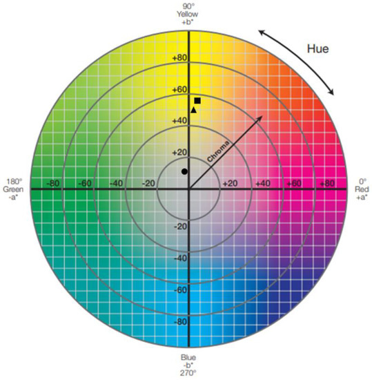 b* chromaticity coordinates, it was possible to determine the approximate color position of these films in the CIELAB hue circle (