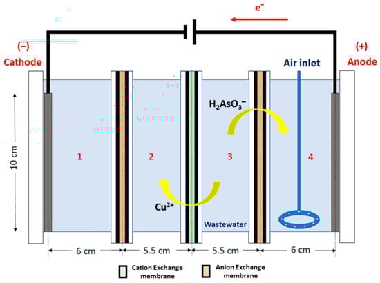The aim of this research is to study a new technology that combines ED and EC to remove the inorganic contaminants arsenic and copper present in wastewater from a copper smelting process, applying electrochemical processes at a low voltage. ED would separate the positively charged copper from the neutral or negatively charged arsenic, even if the concentration of arsenic is much higher than copper. EC would precipitate arsenic in the same cell in the anodic compartment using the same electric current as for the ED part to produce a much lesser volume of sludge with arsenic compared to conventional arsenic-treating precipitation processes. The reagent for the precipitation (in this case, ferric ions) would be generated in situ at the anode. Afterwards, the treated wastewater could be discharged or reused in the copper smelter plant. Therefore, several advantages of the suggested process can be listed: (1) recovery of copper, (2) less final As-sludge, (3) treated wastewater, and (4) less reagent addition. The efficiency of the process is evaluated in a four-compartmental experimental batch setup, where the copper removal and the arsenic precipitation are monitored, and the studied variables are treatment time and current density.