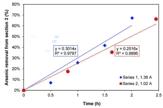 Section 3 for the two experimental series as a function of the charge. The two curves overlap quite clearly, indicating that the passed electric charge is more process-determining than the treatment time itself. Furthermore, the curves also seem to have a linear behaviour. In both experimental series, the maximum removal was approximately 100%, reaching concentrations lower than 1 mg L