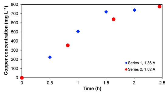 Table 4, the energy consumption for 1.02 A was lower than the consumption for 1.36 A; for that reason, the operational costs of the second case will be higher. On the other hand, the residence time would be higher in the first case, which could lead to higher investment costs. Another parameter to consider is the ratio between energy consumption and the removed mass of copper.