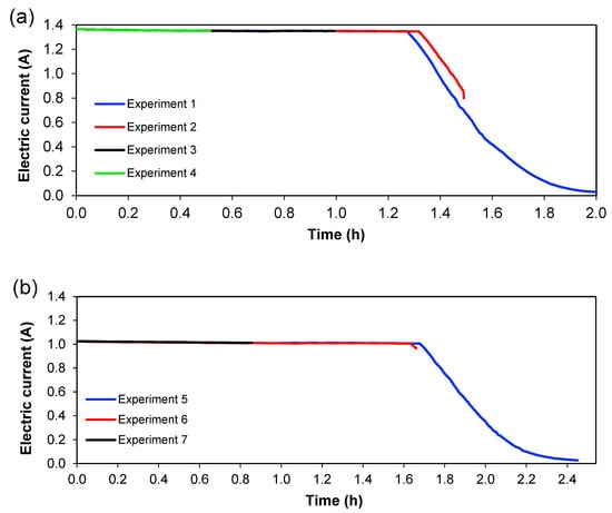 Figure 6, it is seen that the decrease in current started after 1.3 h for 1.36 A; meanwhile, for 1.02 A, this decrease was initiated at 1.6 h.