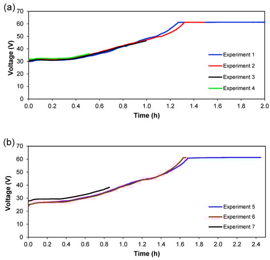 Figure 7, it can also be seen that the reproducibility of the experiments is quite good since the curves for the different experiments overlap each other—at least considering current and voltage.