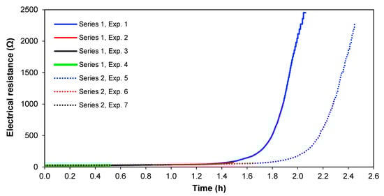 Figure 8 shows the electrical resistance across the whole cell over time for the two series of experiments, at 1.36 A and 1.02 A. From
