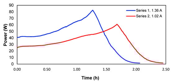 Figure 9 shows the evolution of the power over time for the two studied currents.