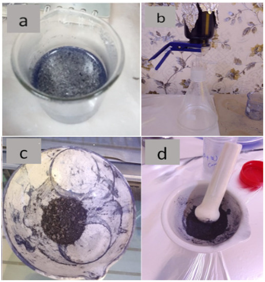 (a) GO and WO2.89 after mixing, (b) vacuum nanofiltration sample, (c) sample after drying, (d) sample after grinding.