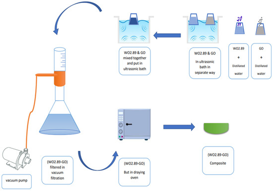 Graphene oxide (GO) was prepared by modified Hummer’s method, as previously reported [32]. WO2.89-GO nanocomposite was successfully synthesized using the ultrasonication method, as shown in Figure 1. The preparation scheme shown in Figure 2 was used to fabricate the samples, following the procedure described by Jeevitha et al. [55]. Briefly, two solutions were made by dispersing 70 mg of WO2.89 in 70 mL of distilled water and 210 mg of GO in 210 mL of distilled water, and then mixed and transferred to an ultrasonication bath for 2 h. The products were collected by vacuum filtration and drying at 100 C for 1 h.