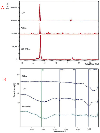 (A) XRD analysis of (GO, WO2.89, and GO−WO2.89), (B) FT−IR analysis of nanoparticles.