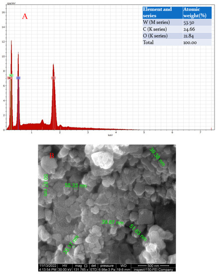 (A) The EDX of GO-WO2.89 nanoparticles and (B) the SEM analysis of composite GO-WO2.89.