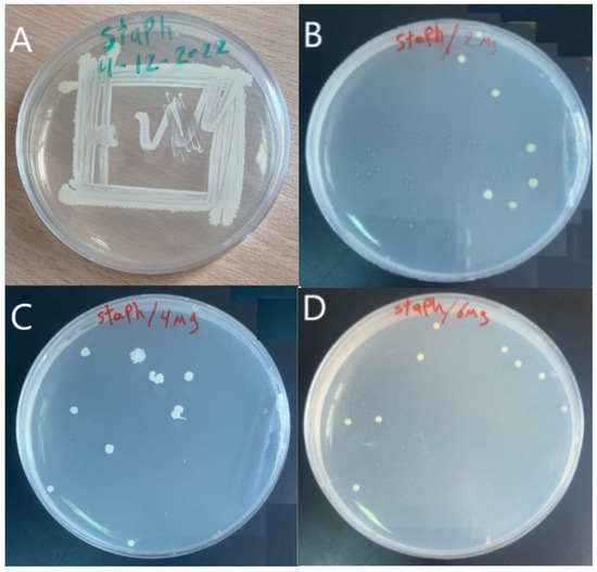 (A) Staphylococcus aureus (Gram-positive), (B) effect of 2 mg (GO-WO2.89), (C) effect of 4 mg (GO-WO2.89), (D) effect of 6 mg (GO-WO2.89) on Staphylococcus aureus (Gram-positive) bacteria.