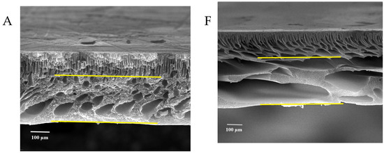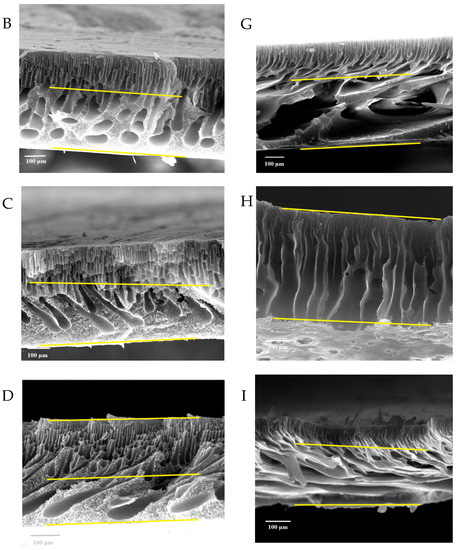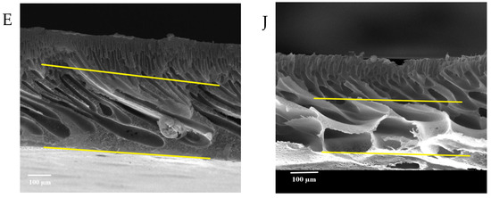 Figure 7 shows the FESEM images of the pure and modified membrane surfaces with varying GO-WO2.89 contents for the PPSU and PPSU/PVP membranes, respectively. GO-WO2.89 nanoparticles increase the pores for the PPSU membrane when increasing the additional amount of nanoparticles, as it can be noticed that, when added PVP to the PPSU membrane, they increase the number of pores compared with the PPSU membrane without PVP polymer because the PVP polymer is considered as pore forming. The membrane’s thickness is an important factor that influences permeability overall membrane separation techniques since it acts as a barrier to compound the transfer across the membrane wall. To improve membrane performance in ultrafiltration applications, the membrane should be appropriately thin when taking mechanical characteristics into account [4]. Figure 8A–E show FESEM images of pure PPSU and the nanocomposite membrane cross-section with varying GO-WO2.89 loading. As can be seen in the cross-section in Figure 8A, finger-like pores formed near the top surface, whereas a sponge layer formed near the bottom layer of a cross-section on the neat PPSU-prepared membrane. The size of finger-like pores is smaller in Figure 8A,B compared with Figure 8C. It can be noticed that the pores in the sponge layer are like tear pores in the pure PPSU membrane and started to be a finger-like structure, as seen in Figure 8C, where the microvoids increased and the sponge-like structure started to decrease with the addition of 0.05 wt. % GO-WO2.89 nanoparticles. When the concentration of GO-WO2.89 nanoparticles in the casting solution increased to 0.1 wt.%, increasing the amount of GO-WO2.89 nanoparticles in the casting solution to 0.15 and 0.2 wt.%, the transformation of the sponge-like structure of the PPSU increased, as shown in Figure 8D,E. Similarly, Figure 8F–J illustrate that the finger-like structure of PPSU/PVP became wider and more porous due to the pore-forming PVP additives. An increase in the amount of GO-WO2.89 nanoparticles increased the finger-like structure and the pores in the sponge layer decreased and became a thin finger-like structure at (0.05 and 0.1) wt.%. This is because the presence of GO-WO2.89 nanoparticles in the polymer solution caused a delay in the liquid–liquid solvent exchange process between the polymer solution and a (water) non-solvent. Yang et al. [61] maintained that at low concentrations of nanoparticles, microvoids expanded and become permeable, but they decreased or disappeared at high concentrations of nanoparticles. The thickness and the structure porosity of each membrane are shown in Table 3.