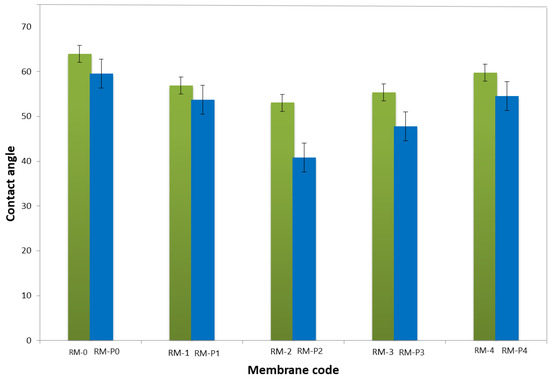 Table 5 compares the membrane performance of PPSU modified with GO-WO2.89 that was presented in the current research with another study that used BSA solution as a removal to test the performance of the membrane. Also shown in Table 5 are the main characteristics of the nanocomposite membranes, including contact angle, flux, and porosity. Comparing the PPSU/GO-WO2.89 membranes to another study, they have such a perfectly rational solution permeation flux. Moreover, Table 5 shows that the contact angle for GO-WO2.89 in the current study was 53.06° for RM-2 and 40.82° for RM-P2, whereas the contact angle for the GO in the casting solution of 1.5 wt.% in the PPSU membrane reported was 67.1° by Xiao et al. [43]. The information presented here leads to the conclusion that the quantity of nanoparticles should be optimized in order to achieve the highest membrane performance values.