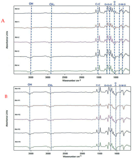 FT-IR is one of the many assessment techniques available for identifying the functional groups on a membrane surface and their probable molecular bonds. The impact of GO-WO2.89 nanoparticles added to a PPSU polymeric membrane at a percentage of (0–0.2) wt.% and a pure PPSU membrane was investigated. Figure 10A shows the FT-IR spectra of the pure synthetic PPSU and mixed matrix membranes. FT-IR spectra for the membranes were recorded in a range of 4000–400 cm−1. The characteristic peaks of infrared asymmetric contraction of the O=S=O functional group were located at 1286 cm−1 and 1155 cm−1 [43]. At the same time, the S=O groups of PPSU were noticed at around (1106.29–1149.21) cm−1. In addition, the peaks at 1486 cm−1 and 1585 cm−1 are for the C=C stretching vibration of the benzene ring [43]. The OH stretching broad band at 3500 cm−1 is related to GO’s hydrophilic character, which could adsorb water droplets via hydrogen bonding. For RM-P0, RM-P1, RM-P2, RM-P3, and RM-P4, Figure 10B shows an absorbance peak at 2950 cm−1 being steadily higher due to the CH2 for PVP carbonyl absorption and even for 3500 cm−1 [62]. The broad peaks observed at 711, 867.23, and 899 cm−1 at >1000 cm−1 are attributed to O-W-O stretching vibrations of WO2.89 [55].