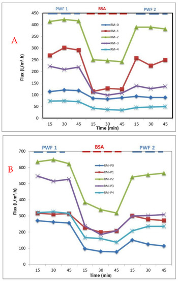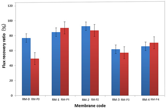 After washing the membrane with distilled water for 30 min, the filtration was resumed. The pure water flux measurement was repeated for 1 h at a pressure of 2 bar. Equation (4) [57] was used to calculate the flux recovery ratio (FRR) of the membrane.