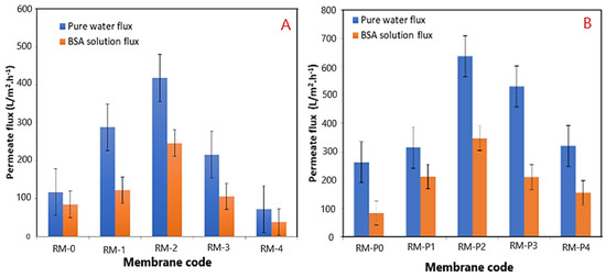 The impact of modified GO-WO2.89 nanoparticle contents in PPSU solution and PPSU/PVP solution on the pure water permeate flux, BSA solution waste permeates flux, and rejection (R%) of BSA solution wastes at an initial BSA concentration of 1 g/L in water, an applied pressure of 2 bar, a temperature of 25 °C, and an effective membrane area of 14.4 cm2, are described in Figure 13A,B. It can be noticed that membranes loaded with GO-WO2.89 nanoparticles at 0.05–0.1 wt.% became more hydrophilic and had higher flux than the pristine PPSU membrane. The permeate flux of pure water and BSA solution waste reached 417.96 L·m−2·h−1 and 246.10 L·m−2·h−1, respectively. For the PPSU/PVP membrane, the permeate flux reached 636.01 L·m−2·h−1 and 347.48 L·m−2·h−1 for pure water and BSA solution waste, respectively, when the GO-WO2.89 content reached 0.1 wt.%. The flux for pure water in pristine PPSU membrane was 117.75 L·m−2·h−1, and it was 85.13 L·m−2·h−1 for BSA solution waste. PPSU/PVP membrane flux for pure water and BSA solution waste was 263.45 L·m−2·h−1 and 84.65 L·m−2·h−1, respectively. The permeate flux increase was due to the membrane’s hydrophilic nature and pore size. After mixing GO-WO2.89, the CA is not the only factor that affects the flux. As can be seen in Table 3 and the cross-section image in Figure 8, the porosity is high enough to allow the solution to pass through the membrane, and the pores become a finger-like structure when the content of the nanoparticles increased to 0.1 wt.% for RM2 as well as for RM-P2 that incorporated with the PVP polymer, responsible for increasing the porosity and the hydrophilic nature of the membrane that will affect the increase in the permeate flux. Furthermore, as shown in Table 3, the thickness of the membrane decreased for the content of 0.05 to 0.1 wt.%. The membrane’s hydrophilicity can explain this increase due to the incorporation of GO-WO2.89 nanoparticles and sufficient ion exchange sites. Flow rates across highly hydrophilic membranes are quite high. In other words, loading GO-WO2.89 nanoparticles within these ratios strongly affected the surface hydrophilicity and membrane structures, which become two significant variables affecting permeability and selectivity. The increase in the surface hydrophilic nature positively affects water permeation flux [4]. Moreover, increasing the concentration of GO-WO2.89 to 0.2 wt.% resulted in a gradual reduction in the permeate flux. The permeate flux was reduced to 216.33 and 72.69 L·m−2·h−1 for pure water and 106.21 and 38.26 L·m−2·h−1 for BSA solution for the PPSU membrane. Further, it was 529.93 and 320.76 L·m−2·h−1 for pure water and 210.68 and 154.98 L·m−2·h−1 for BSA solution waste for the PPSU/PVP membrane when the GO-WO2.89 content reached 0.15 and 0.2 wt.%, respectively. The decline in permeate flow was caused by nanoparticle aggregation on membrane surfaces. The possible explanation for varying concentrations of nanoparticles is to investigate nanoparticle agglomeration in the membranes. Nanoparticle agglomeration is a significant issue that would result in unacceptable changes in the membrane’s properties, such as decreased water flux and mechanical strength. To avoid the problem, many studies recommend a relatively low quantity of nanoparticles [4,63]. Also as notice in Figure 14 there is a relation between the permeation flux and permeate volume so when increasing the volume it will be increase the permeate flux of the membranes, respect to Equation (1).