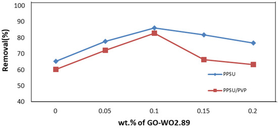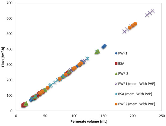 Figure 14 shows the permeation flux is related to the permeate volume linearly. As shown in Figure 15, the rejection percentage (R%) for the pure PPSU membrane initially was 65.28% and 60.1% for the PPSU/PVP membrane but it increased as the loading of GO-WO2.89 increased. The R% values for the PPSU membrane increased to 77.699% and 85.97%, and for the PPSU/PVP membrane were 72% and 82.87% at loading amounts of 0.05 and 0.1 wt.%, respectively. The R% decreased slightly at the loading amounts of 0.15 and 0.2 wt.% of GO-WO2.89 81.837% and 76.66% for the PPSU membrane and 66.31% and 63.21% for the PPSU/PVP membrane, respectively. The highest rejection obtained was 85.97% for the PPSU membrane and 82.87% for the PPSU/PVP membrane at a loading value of 0.1 wt.%. The enhanced rejection of BSA was because of an increase in the adsorption sites provided by GO-WO2.89 in membrane texture. The aggregation of GO-WO2.89 nanoparticles on the top layer of the membranes at 0.15 and 0.2 wt.% of NPs was responsible for the decrease in the rejection R% of BSA. Li guang et al. [64] reported a decrease in the rejection of BSA solution after the agglomeration of nanoparticles on the polymeric membrane.