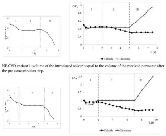 The composition of the final retentates obtained was characterized by a much higher amount of chromium than the initial amount and a lower amount of salt, depending on the amount of water added in the diafiltration stage (Table 2). However, in the variant of the NF-CVD process 1 where the volume of the introduced solvent was equal to the volume of the received permeate after the pre-concentration step, the salt concentration decreased only from 20.0 g∙L−1 to about 12.5 g∙L−1. The concentration stage in this variant lasted a relatively short time due to the rapid decrease in the efficiency of the process, which resulted in a relatively large final retentate volume of 1.6 L. The small reduction in the feed volume caused the chromium concentration in the final retentate to be 3.81 g∙L−1. For variant 2 of the NF-CVD process, where the volume of the introduced solvent was equal to the volume of the obtained retentate after pre-concentration, the final salt concentration in the retentate was 7.65 g∙L−1. The significant reduction in the salt concentration in the diafiltration stage enabled the volume of the feed to be reduced almost three times. As a result, the final concentration of chromium in the retentate was 4.93 g∙L−1. In variant 3 of the NF-CVD process, at the diafiltration stage, the solvent was introduced to the pre-concentrated retentate in a volume over three times larger than the volume of the permeate collected in the pre-concentration step. The consequence of such an action was a final concentration of chlorides in the retentate at the level of 5.81 g∙L−1. As a result, during the final concentration step, it was possible to reduce the volume of the retentate more than three times, and obtain a final concentration of chromium in the retentate of 5.48 g∙L−1.