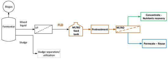 The general processing scheme, depicted in Figure 1, is considered in this study to serve the objective of complete FLD valorization; i.e., nutrients’ recovery and treated effluent suitable for full reuse/recycling. Typical FLD is obtained from an industrial plant, installed and operating in a dairy industry in Central Greece (BIZIOS S.A.). The plant is comprised of an anaerobic fermentor (producing biogas), an excess-sludge separation system and a UF unit (Memthane® [42]) leading to FLD free of solids. Further main processing steps, examined here, include (i) FLD pretreatment and (ii) an NF/RO membrane separation unit targeted to yield a permeate appropriate for reuse/recycling and a concentrate stream to be utilized for nutrient recovery/reuse, after possible conditioning/processing.
