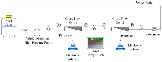 The employed experimental set-up, depicted in Figure 2, has been described in previous work [55]. The unit included two test sections of narrow (1 mm) gap, employing flat sheet membrane pieces of filtration area 130.35 cm2 (5.5 cm × 23.7 cm) as well as a common commercial net-type spacer. The feed solution was recirculated via a triple-diaphragm high-pressure pump (P200MSTSSA05A, Wanner Intern. Ltd., UK), and the permeate mass rate was continuously recorded with an electronic balance (PL602-S, Mettler-Toledo, Columbus, OH, USA) connected to a computer for automatic data acquisition (GeniDAQ, Advantech Co. Ltd., Taipei, Taiwan). A substantial amount of original feed fluid was employed (~6–8 L, in a temperature stabilized feed vessel) to enable smooth experimentation for long-time tests. Samples of all process streams could be collected periodically. Pictures of this experimental set-up are included in the Supplemental Materials (Figure S2).