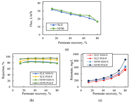 Effect of permeate recovery on (a) flux, (b) nutrient rejection, (c) nutrient concentration in retentate. Feed: synthetic solutions of NH4-N and PO4-P (150 mg/L each); NF90 and XLE membranes. Dead-end filtration, constant pressure 5 bar.