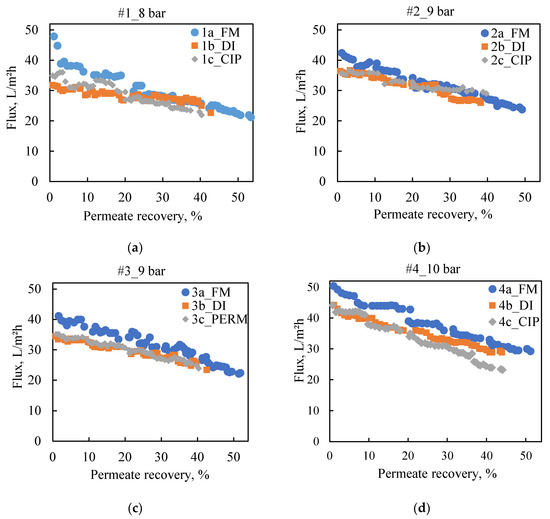 FM: Fresh membrane; DI: Flushing with deionized water; CIP: Cleaning protocol; PERM: Flushing with permeate; a Cross-flow velocity: 22 cm/s; b Nominal permeability calculated from experimental data provided by the manufacturer: 10.3 L/m2·h bar