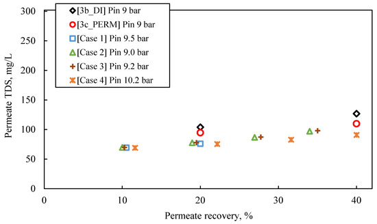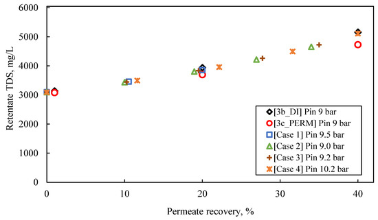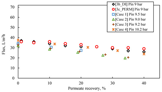 Among tests 2P–4P, test 4P exhibited the best performance with higher flux and permeate recovery up to 70% (Figure S7), possibly attributed to the lower inorganic content of the feed solution (3880 μS/cm), compared to that of tests 2P and 3P (~4900 μS/cm). Nevertheless, flux values were almost 50% lower than those observed in cross-flow tests with dilute synthetic solutions at similar test conditions. This fact is attributed to the increased osmotic pressure of FLD, which led to lower effective transmembrane pressure ΔΡ (i.e., ΔΡ = Papplied − Posmotic) of the process. As also shown in Figure S7, the flux decline in tests 1P–4P is typical for batch processes where concentration polarization and/or fouling phenomena take place [60,61].