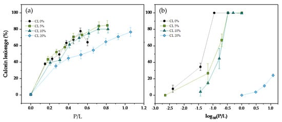 Percentage of calcein release as a function of the peptide to lipid molar ratio (P/L) for (a) LL−37, and (b) ATRA−1 in DMPG 100 nm unilamellar vesicles containing varying molar percentages of CL. All measurements were performed at 37 °C.