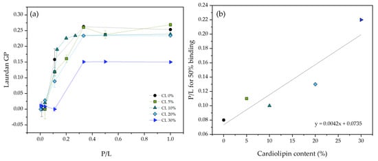 (a) ATRA−1 binding isotherms in the presence of DMPG unilamellar vesicles containing varying amounts of CL, as measured by monitoring Laurdan generalized polarization. (b) P/L ratio needed to reach 50% binding is plotted as a function of cardiolipin content. All measurements were performed at 37 °C.