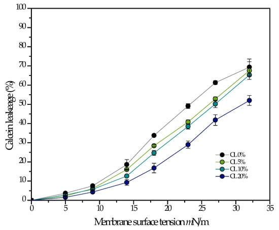 Cardiolipin has been proposed to confer mechanical resistance to bacterial membranes. In particular, bacteria overproduce cardiolipin when exposed to high salinity or osmotic stress []. For this reason, an experiment that would show this behavior in a model system was performed by fluorescence spectroscopy. In Figure 4, calcein containing DMPG liposomes with varying amounts of cardiolipin were subjected to osmotic stress, and the percentage of content leakage was quantified. The results show that the percentage of leakage increases monotonically as a function of membrane tension, but to a lesser extent when the liposomes contain cardiolipin, supporting the notion that cardiolipin does increase the mechanical strength of the membrane, at least to tension induced pore formation.