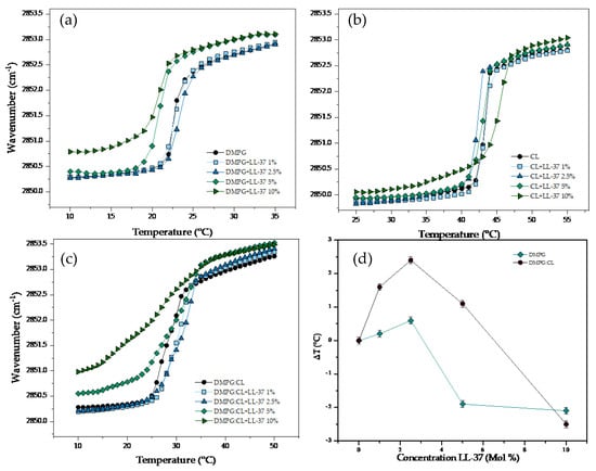 Peak positions of the symmetric stretching vibration bands of the methylene groups in dependence on temperature. Different concentrations of LL−37 in supported lipid bilayers of (a) DMPG, (b) CL and (c) DMPG:CL. (d) Change of Tm (△T) in the DMPG and DMPG:CL.