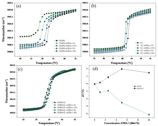 The results of the temperature dependence of the wavenumber values of the peak positions of the DMPG, CL, and DMPG:CL acyl chains in the presence of ATRA-1 are presented in Figure 6. The interaction of ATRA-1 with DMPG lipid bilayers induced a strong fluidization effect even at the lowest concentration evaluated (1%) with a reduction of the Tm up to 1.1 °C (Figure 6a). Additional increasing concentrations of ATRA-1 induced progressive fluidization of the DMPG bilayers. The effect is evident in the gel phase, where the increase in the wavenumber was up to 1 cm−1 at a fixed temperature, and at the highest concentration evaluated of the peptide (10%), the Tm was shifted downwards by much as ca. 4.1 °C. The effect of the incubation of the peptide ATRA-1 with the CL bilayers is summarized in (Figure 6b). The interaction of the peptide induced a slight destabilization effect in the lipid bilayers in comparison with the effect observed in DMPG. Below and above the Tm, increasing concentrations of ATRA-1 induced a slight increase in the fluidity, the effect is related with a mild reduction of the Tm. All the results of the Tm are summarized in Table 3. The results of the interaction of ATRA-1 with DMPG:CL are presented in Figure 6c. Increasing concentrations of the peptide induced an opposite effect in comparison with the pure lipids. The incubation of the mixture of lipids with ATRA-1, induced a reduction in the fluidity of the lipid systems, with a gradual increase of the Tm. At the highest concentration evaluated for ATRA-1 (10%), the temperature increases up to ca. 3.6 °C. Figure 6d shows the variation in the main phase transition temperature (∆T) for DMPG and DMPG:CL lipid models in the presence of increasing ATRA-1 concentration. The results in Figure 5d show that ATRA-1 induces a depression of the main phase transition for pure DMPG membranes at all peptide concentrations. For the DMPG:CL mixtures, the phase transition temperature increases and remains high at all the peptide concentrations tested.