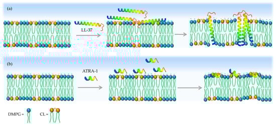 The physicochemical characteristics of the peptides LL-37 and ATRA-1 are summarized in Table 1. The cathelicidin peptide LL-37 is of human origin with broad antimicrobial activity towards Gram-positive and Gram-negative bacteria, which forms part of the primary immune response in humans [,,,]. This widely studied antimicrobial peptide is 37 residues in length and presents an amphipathic α-helical structure, both in aqueous solutions and when bound to bilayer membranes [,]. The LL-37 initially binds parallel to the membrane, and, after reaching a threshold concentration, inserts vertically. Different insertion and aggregation mechanisms have been proposed that appear to be highly sensitive to the peptide to lipid ratio, and its ability to stabilize the inverted hexagonal phase has been used as evidence of a toroidal pore structure during pore formation, but only for certain concentrations [].
