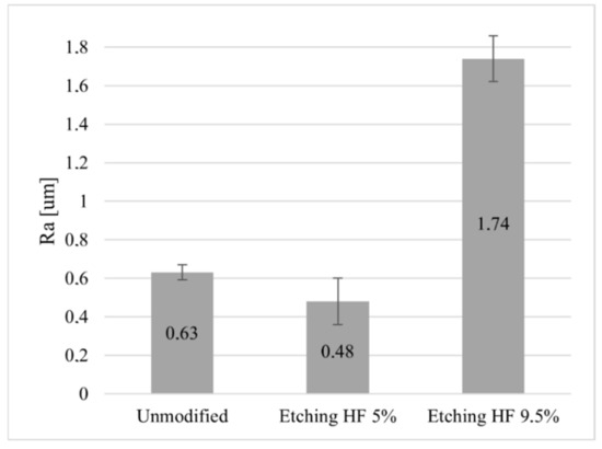 To measure the change in ceramic surface roughness after etching with hydrofluoric acid (HF), a contact profilometer HOMMEL TESTER T1000was used, supported by the Turbo Datawin NT 1.34 software, both from JENOPTIK Industrial metrology, Villingen-Schwenningen, Germany, enabling the determination of surface roughness and waviness parameters based on the obtained etching profiles. Based on the Ra measurement results, the effect of HF acid concentration on the change in the surface topography of the tested samples was determined.