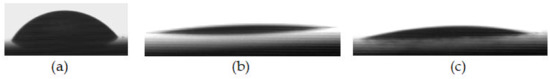 Change in a water droplet shape on the Al2O3 ceramic surface: (a) unmodified, (b) plasma modification, (c) chemical modification.