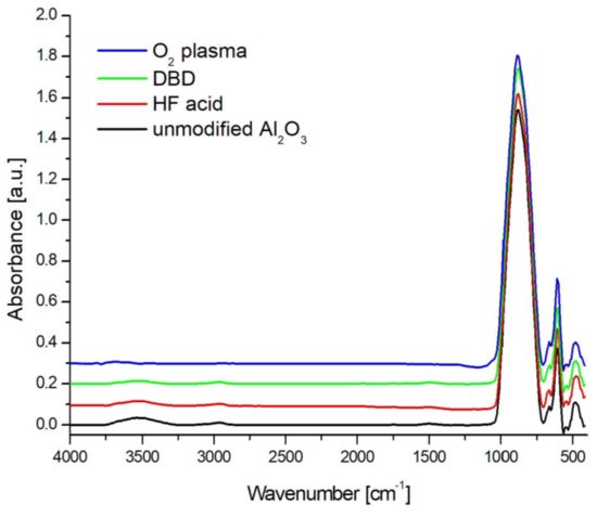 The waveform of spectra for HF acid- and DBD-modified ceramics was identical to that for unmodified ceramics. The only significant difference was in the range of 3300–3700 cm−1 and was associated with a smaller amount of hydroxyl groups chemically and physically bonded to the surface. The shape of the spectra did not change.