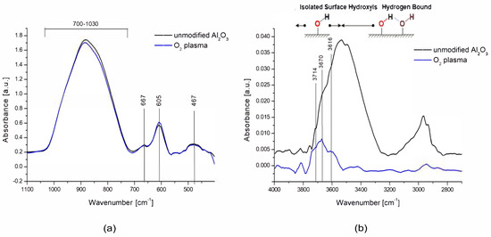 Modification of the ceramic surface in low-temperature oxygen plasma resulted in the removal of most of the hydroxyl groups derived from molecular water physically bonded to the tested surface which is presented in Figure 4a. In the range of 3600–3800 cm−1, three peaks at wave numbers 3714, 3670, and 3615 cm−1 remained well separated, originating from chemically bonded, isolated hydroxyl groups, which, according to the theory of Busce and Tsyganenko, can originate from bridged and triple bridged oxygen, as well as terminal Al-OH groups. Some of these maxima could also be isolated in the spectra of ceramics before modification because they were components of a wide band coming from the adsorbed molecular water [45].