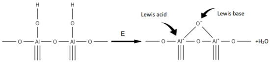 The chemically bound water on the aluminium oxide surface is considered as an interaction between the electron-accepting aluminium ion (Lewis acid) and the hydroxyl donor ion, which is the so-called Lewis principle. On the other hand, hydroxyl groups behave as Bronsted acid sites. However, high-energy plasma surface cleaning can cause two adjacent OH ions on the alumina surface to form an oxygen bridge, which, however, is the Lewis acid active site, as shown in the diagram below (Figure 5). Such a system exhibits chemical activity and is able to bind both water and other chemical structures [46,47]. This process takes place with the release of water, which is removed from the reaction environment during the modification taking place in a vacuum.