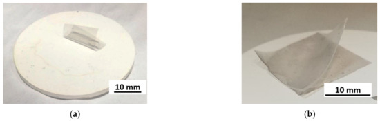 Al2O3 ceramic surface during HSMG® graphene transfer sample: (a) without surface modification—lack of graphene–PMMA adhesion to the surface; (b) with surface modification—graphene adheres to the surface of ceramics; delamination of an additional PDMS layer during removal of the PMMA support layer in alcohol vapour.