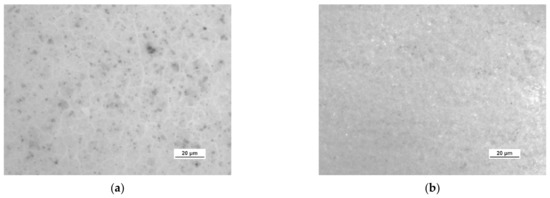 Investigations of the ceramics’ wettability with the use of distilled water showed that corundum oxide (Al2O3) has weak hydrophilic properties, consistent with the literature data [42]. After treatment with plasma with barrier discharges and oxygen plasma, the surface became superhydrophilic; due to this, the measurement of the contact angle using the drop geometry method is burdened with a large error (Figure 2b). The improvement of the wettability of the ceramic surface was also obtained as a result of chemical modification. However, the obtained effect of improving the hydrophilicity of the surface after acid treatment was weaker than as a result of plasma. Furthermore, the results show that increasing the acid concentration 2-fold did not significantly increase this effect. The results of the contact angle measurements with distilled water of pure and modified ceramic samples are presented in Table 2, and Figure 2 shows the change in the appearance of water droplets on the ceramic surface after the applied modifications.