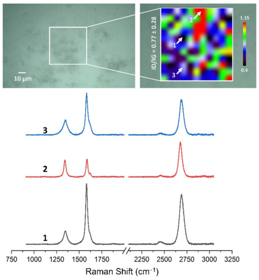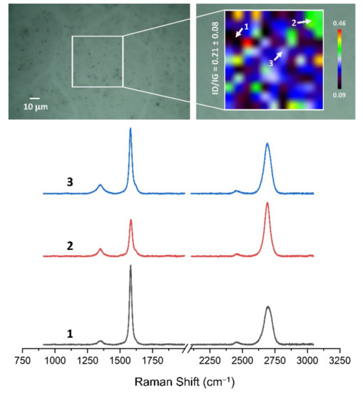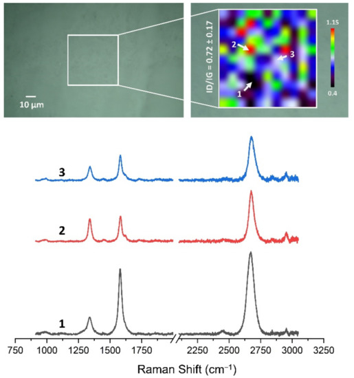 The Raman spectra and maps were carried out with an InVia Raman microscope (Renishaw plc, Gloucestershire, UK) system. The graphene surfaces were exanimated using a 532 nm laser with a 50× objective lens (Carl-Zeiss, Jena, Germany). The laser power at the sample was restricted to 4 mW. For Raman maps, map image acquisition mapping was applied in the wavenumber range of 900 to 3200 cm−1. Two-dimensional Raman maps were collected from 50 × 50 μm areas with 5 μm spatial resolution. All the collected Raman spectra and maps were preprocessed using WiRE 5.5 software (Renishaw plc, Gloucestershire, UK).