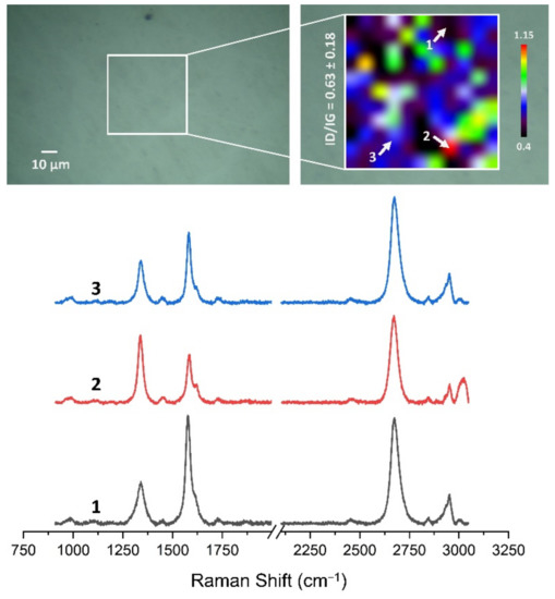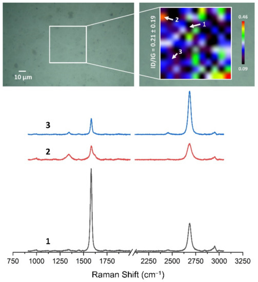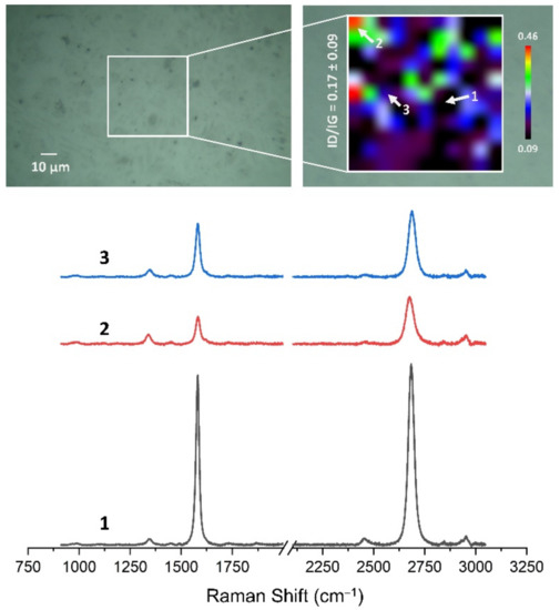 Figure 13, Figure 14, Figure 15, Figure 16, Figure 17 and Figure 18 show Raman maps of HSMG® and CVD graphene transferred onto Al2O3 ceramic substrates modified by the three different methods. The spectra presented are typical of the graphene [7,11,13,31,33,48,49] with prominent D (at about 1340 cm−1), G (at about 1580 cm−1), and 2D (about 2690 cm−1) peaks. The presented maps show the change in the ratio of D to G peaks on the studied surfaces, which, according to the literature [11,49,50,51], are indicative of changes in the degree of graphene defects after transfer to surface-modified Al2O3 ceramics. On the studied surfaces, the lowest, highest, and intermediate degree of defect sites with the lowest (marked “1”), highest (marked “2”), and intermediate (marked “3”) ID/IG ratio values are indicated. The least damaged layer of HSMG® graphene was obtained after transfer to ceramics modified by oxygen plasma (RF PACVD). The most defective HSMG® graphene was on ceramics etched with 5% HF. The same was true for CVD graphene. The least damaged graphene was found on ceramics modified with oxygen plasma and a similar result was obtained for the barrier plasma. The degree of damage to the graphene layer on the substrate etched with 5% HF was the highest.