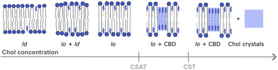 Different membrane domains (ld—liquid-disordered domain, lo—liquid-ordered domain) formed in a lipid bilayer at different Chol concentrations from lower to higher content. CBDs start to form above the CSAT, and Chol precipitates in the form of Chol crystals above the CST level [21].